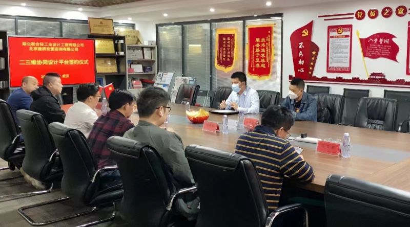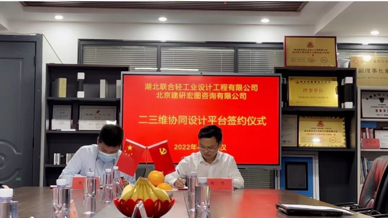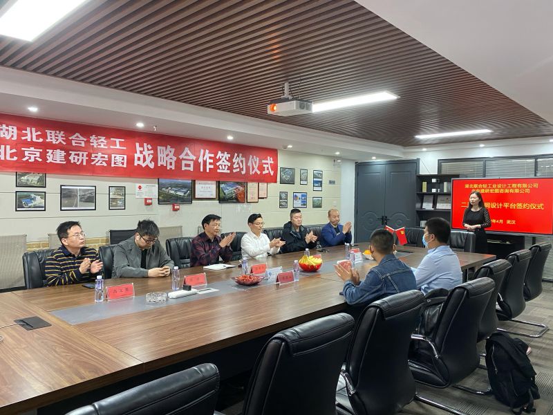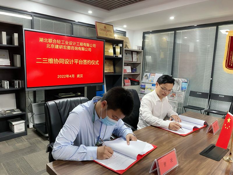和煦四月,春意盎然。2022年4月8日上午,湖北联合轻工业设计工程有限公司与北京建研宏图咨询有限公司在我公司隆重举行二三维协同设计平台签约仪式。